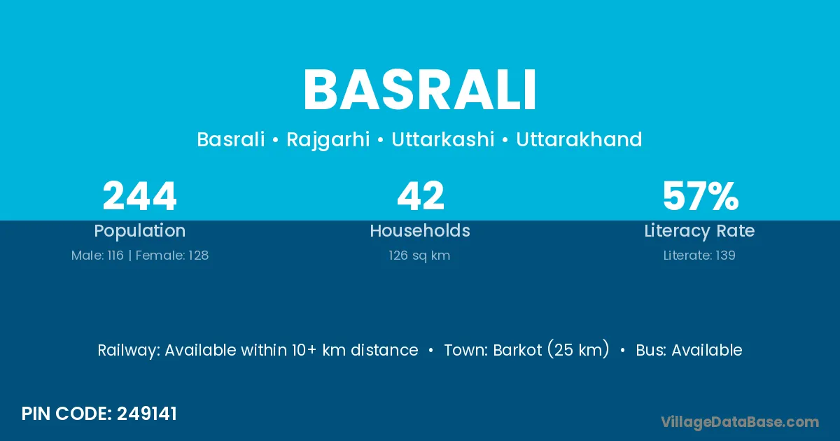 Barkot (25 km) is the nearest town to Basrali village for major economic activities and is located approximately 25 km away.