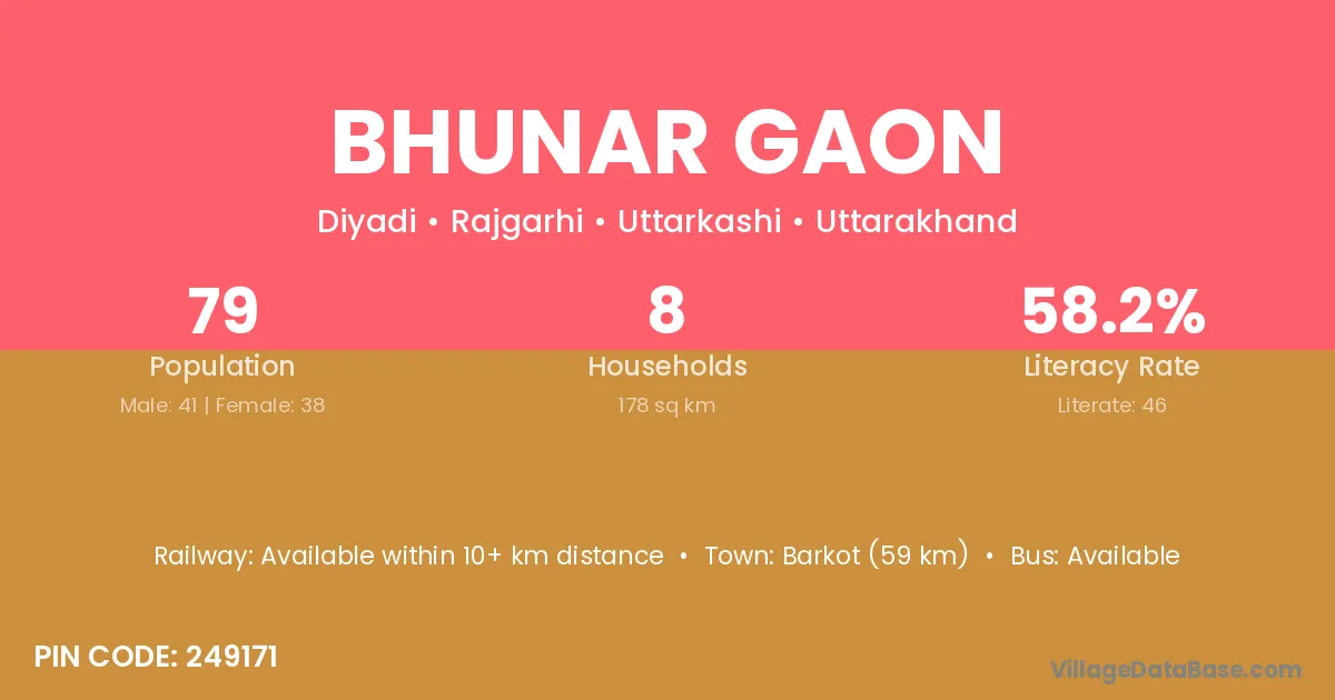 Barkot (59 km) is the nearest town to Bhunar Gaon village for major economic activities and is located approximately 59 km away.