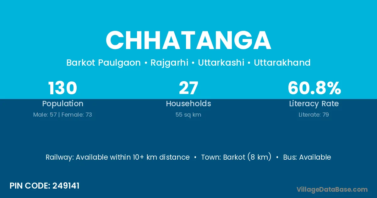 Barkot (8 km) is the nearest town to Chhatanga village for major economic activities and is located approximately 8 km away.