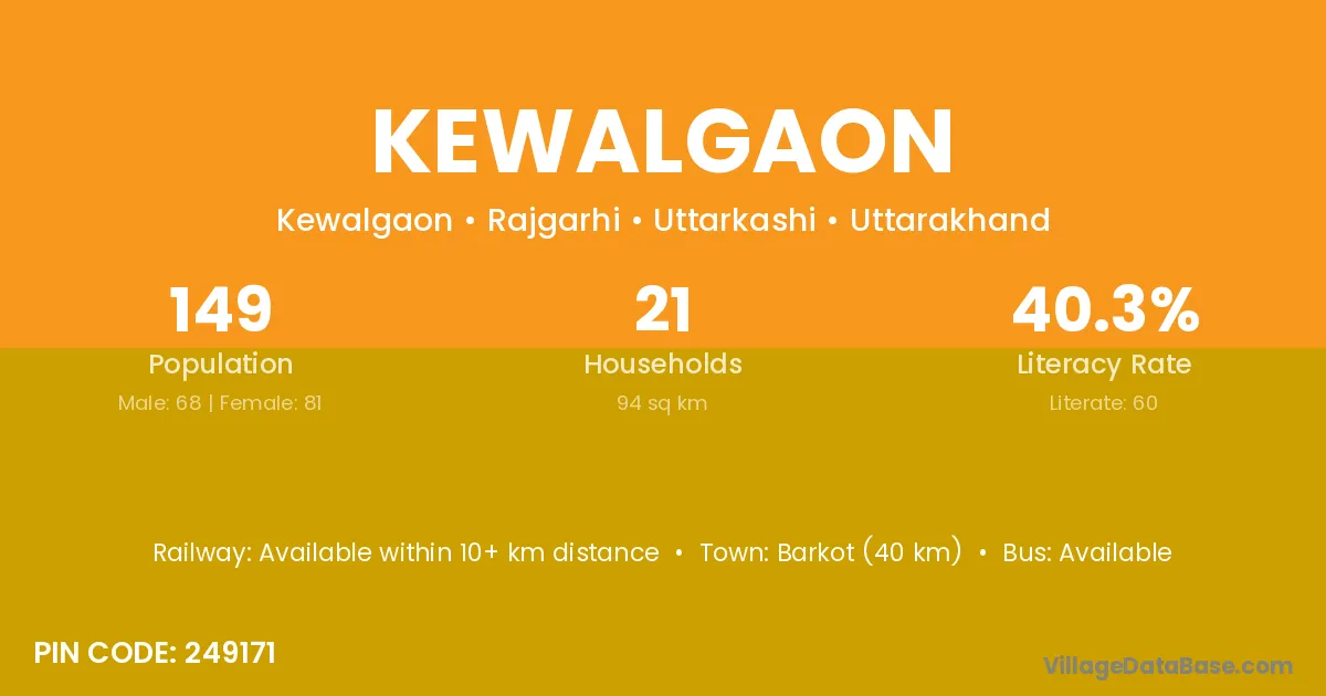 Barkot (40 km) is the nearest town to Kewalgaon village for major economic activities and is located approximately 40 km away.