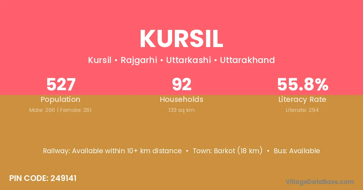 Barkot (18 km) is the nearest town to Kursil village for major economic activities and is located approximately 18 km away.