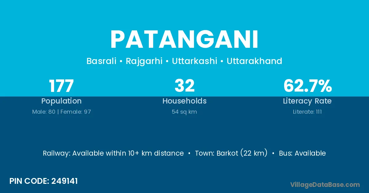 Barkot (22 km) is the nearest town to Patangani village for major economic activities and is located approximately 22 km away.