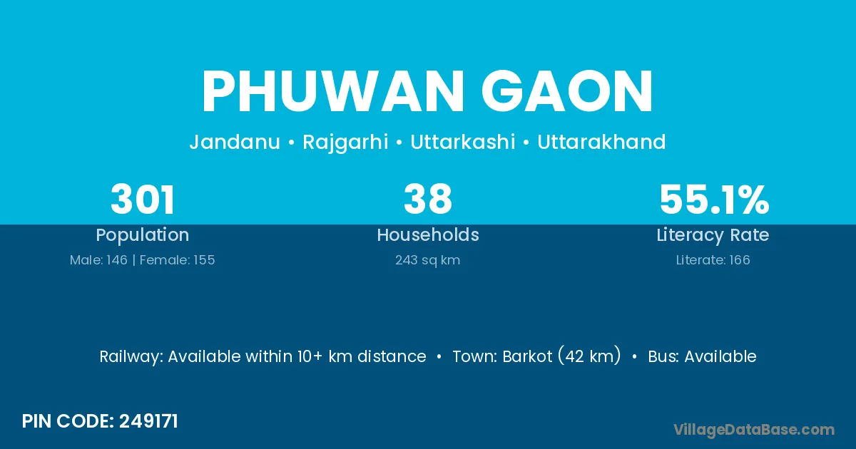 Barkot (42 km) is the nearest town to Phuwan Gaon village for major economic activities and is located approximately 42 km away.