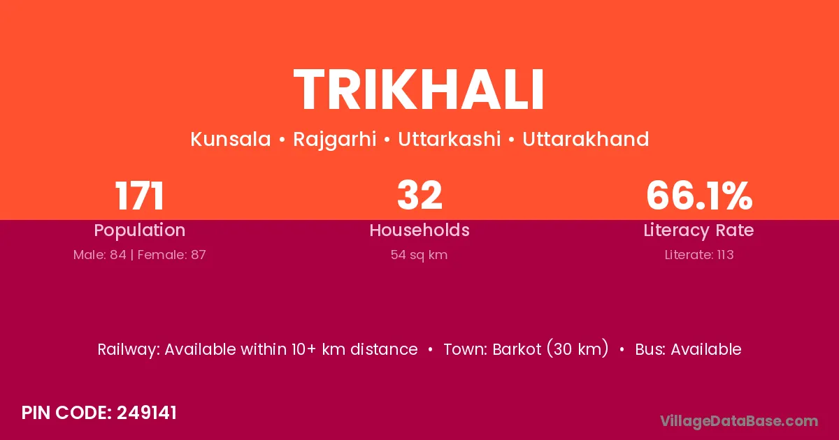 Barkot (30 km) is the nearest town to Trikhali village for major economic activities and is located approximately 30 km away.