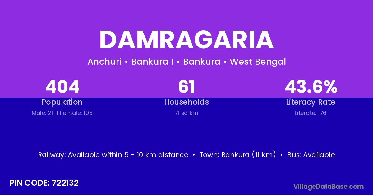 Bankura (11 km) is the nearest town to Damragaria village for major economic activities and is located approximately 11 km away.