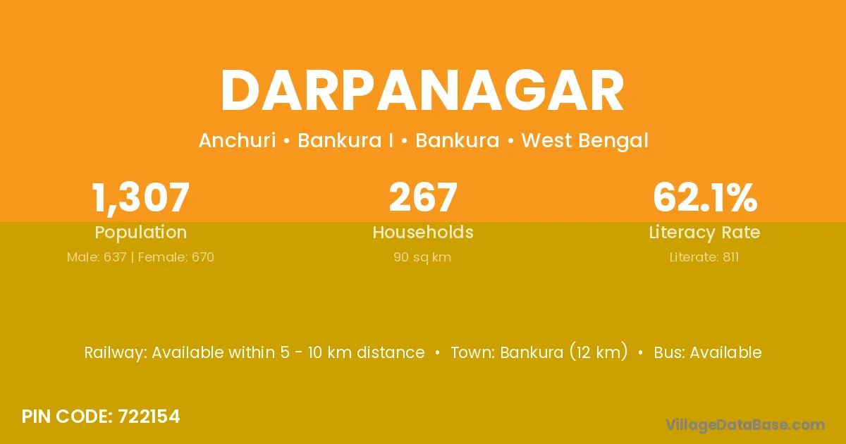 Bankura (12 km) is the nearest town to Darpanagar village for major economic activities and is located approximately 12 km away.
