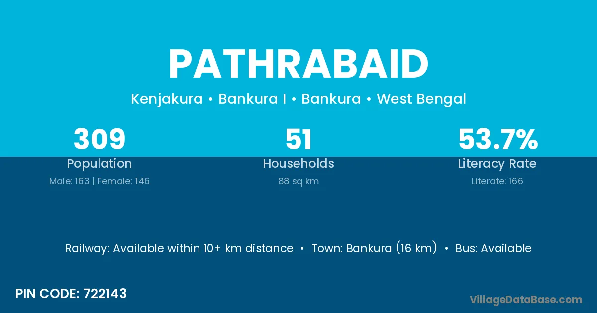 Bankura (16 km) is the nearest town to Pathrabaid village for major economic activities and is located approximately 16 km away.