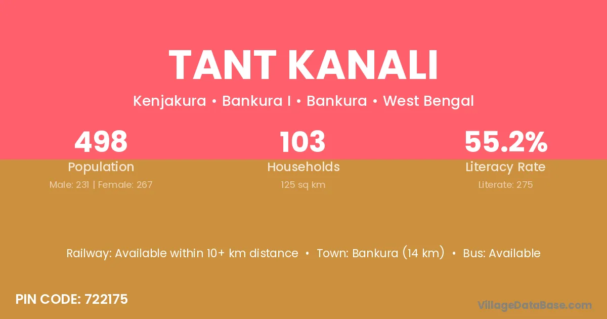 Bankura (14 km) is the nearest town to Tant Kanali village for major economic activities and is located approximately 14 km away.