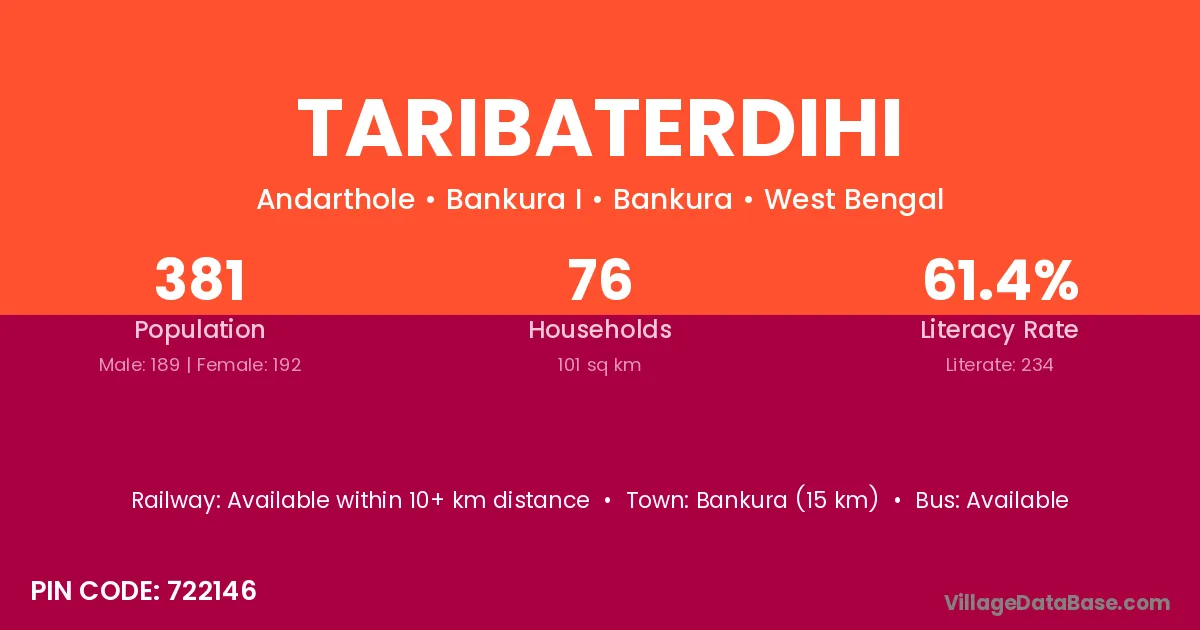 Bankura (15 km) is the nearest town to Taribaterdihi village for major economic activities and is located approximately 15 km away.