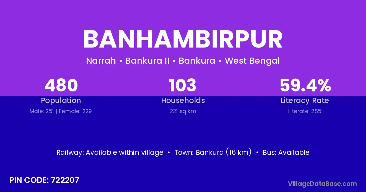 Bankura (16 km) is the nearest town to Banhambirpur village for major economic activities and is located approximately 16 km away.