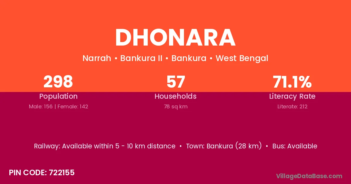 Bankura (28 km) is the nearest town to Dhonara village for major economic activities and is located approximately 28 km away.