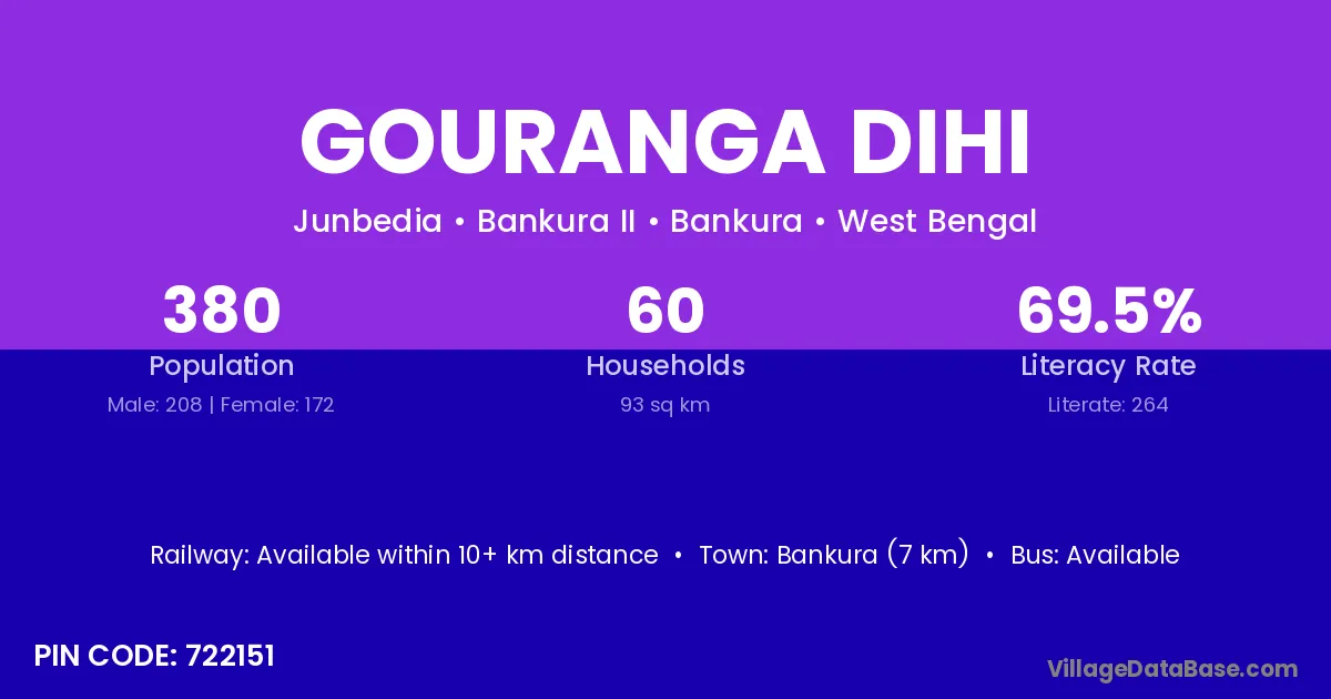 Bankura (7 km) is the nearest town to Gouranga Dihi village for major economic activities and is located approximately 7 km away.