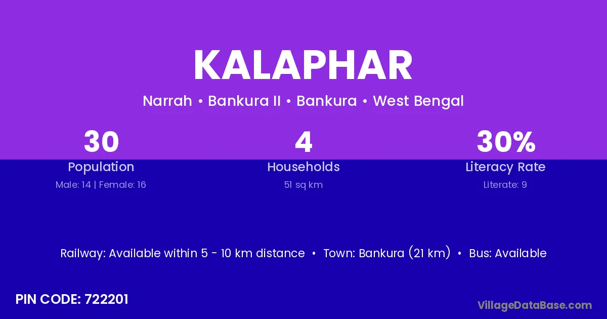 Bankura (21 km) is the nearest town to Kalaphar village for major economic activities and is located approximately 21 km away.