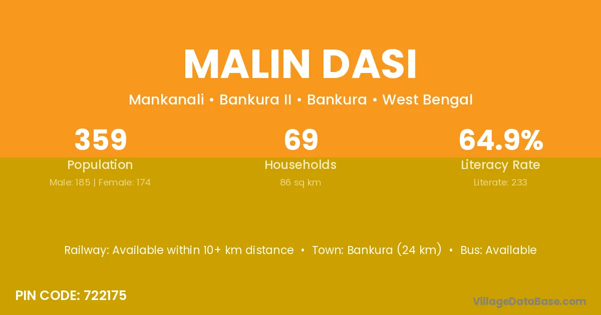 Bankura (24 km) is the nearest town to Malin Dasi village for major economic activities and is located approximately 24 km away.
