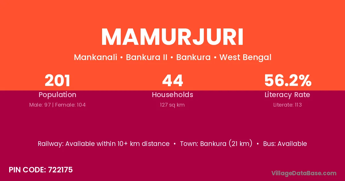 Bankura (21 km) is the nearest town to Mamurjuri village for major economic activities and is located approximately 21 km away.