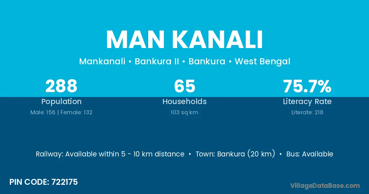 Bankura (20 km) is the nearest town to Man Kanali village for major economic activities and is located approximately 20 km away.