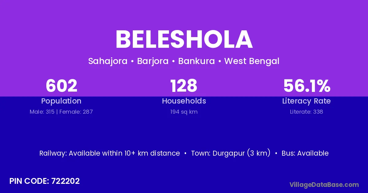 Durgapur (3 km) is the nearest town to Beleshola village for major economic activities and is located approximately 3 km away.