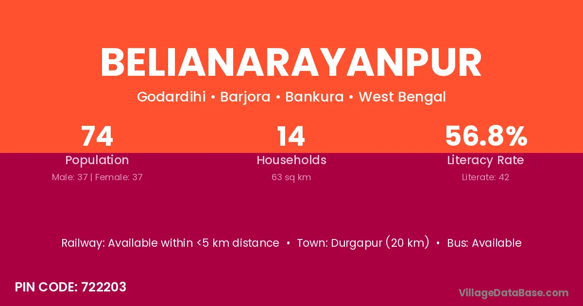 Belianarayanpur village has a total population of 74 people, of which 37 are males and 37 are females.