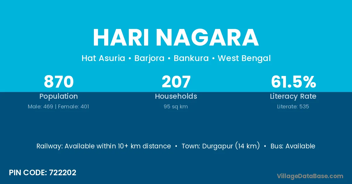 Durgapur (14 km) is the nearest town to Hari Nagara village for major economic activities and is located approximately 14 km away.