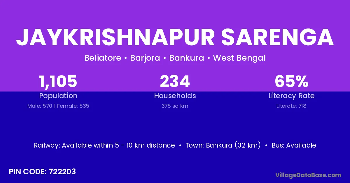 Bankura (32 km) is the nearest town to Jaykrishnapur Sarenga village for major economic activities and is located approximately 32 km away.