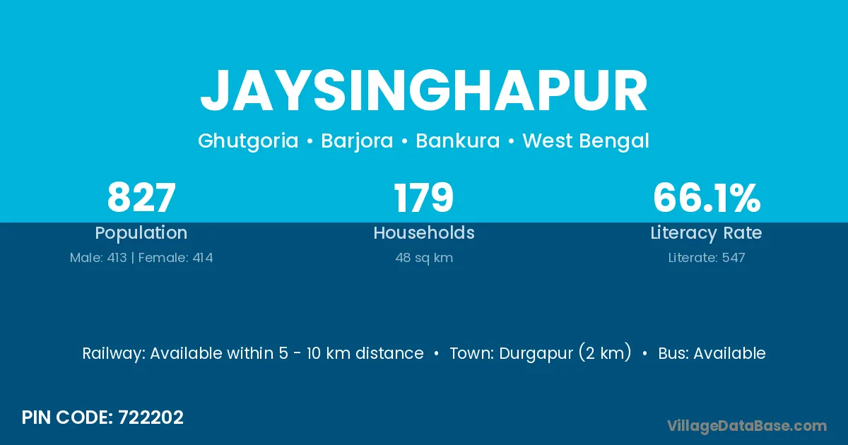 Durgapur (2 km) is the nearest town to Jaysinghapur village for major economic activities and is located approximately 2 km away.