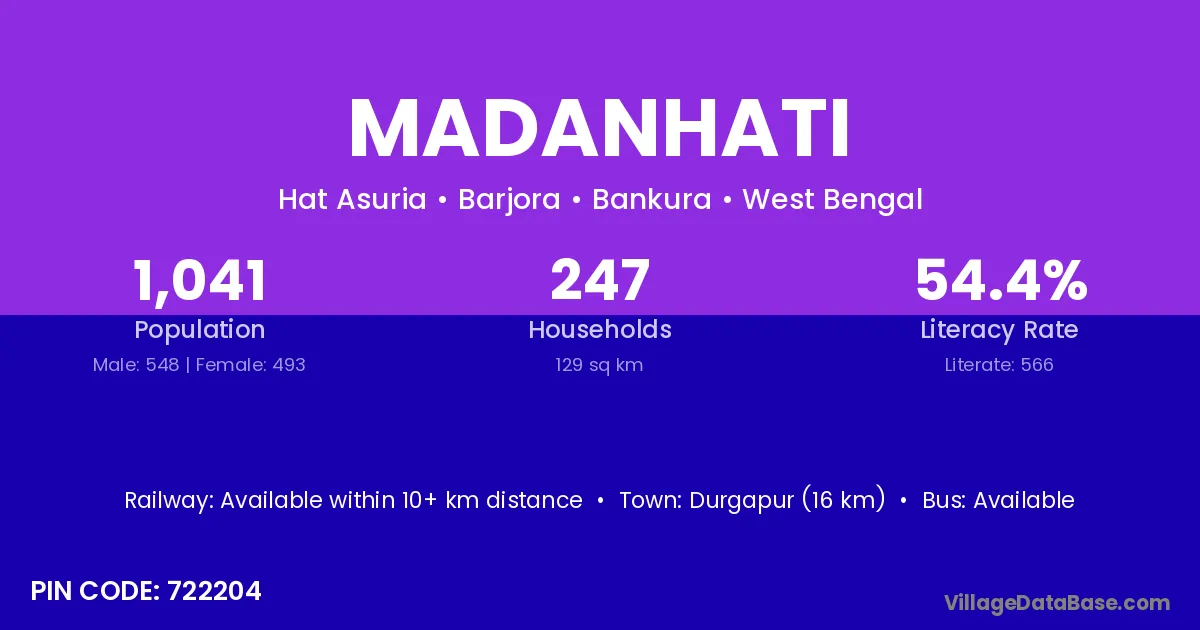 Durgapur (16 km) is the nearest town to Madanhati village for major economic activities and is located approximately 16 km away.