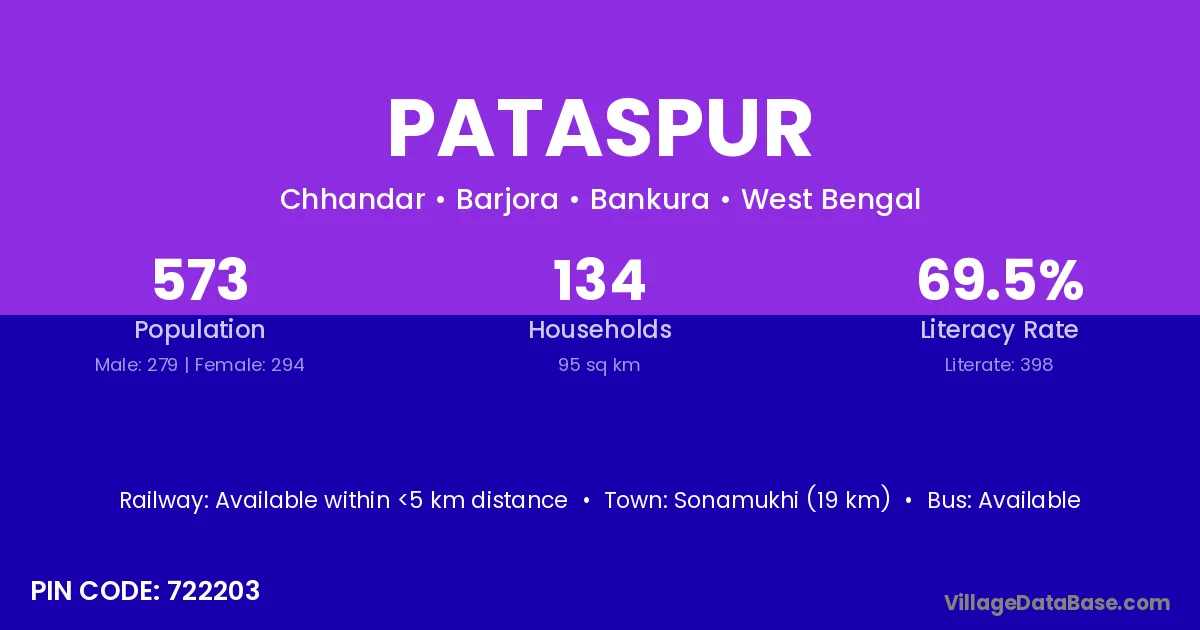 Sonamukhi (19 km) is the nearest town to Pataspur village for major economic activities and is located approximately 19 km away.