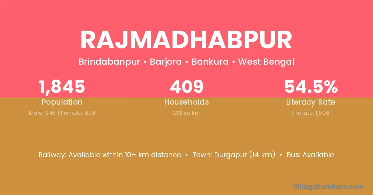 Durgapur (14 km) is the nearest town to Rajmadhabpur village for major economic activities and is located approximately 14 km away.