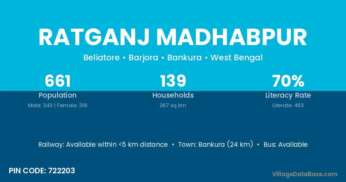 Bankura (24 km) is the nearest town to Ratganj Madhabpur village for major economic activities and is located approximately 24 km away.