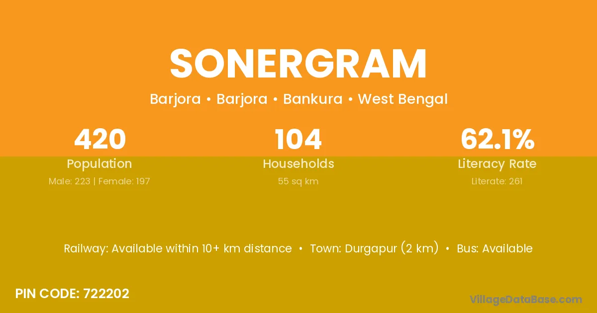 Durgapur (2 km) is the nearest town to Sonergram village for major economic activities and is located approximately 2 km away.