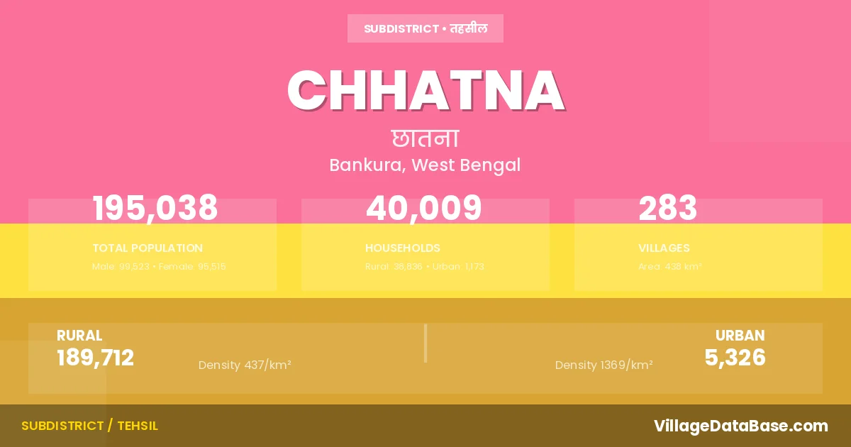 According to the 2011 census The total area of Chhatna Subdivision is 438 km², with a population of 195038 people. The population density is 445 inhabitants per square kilometre, and there are approximately 40009 houses in the sub district.