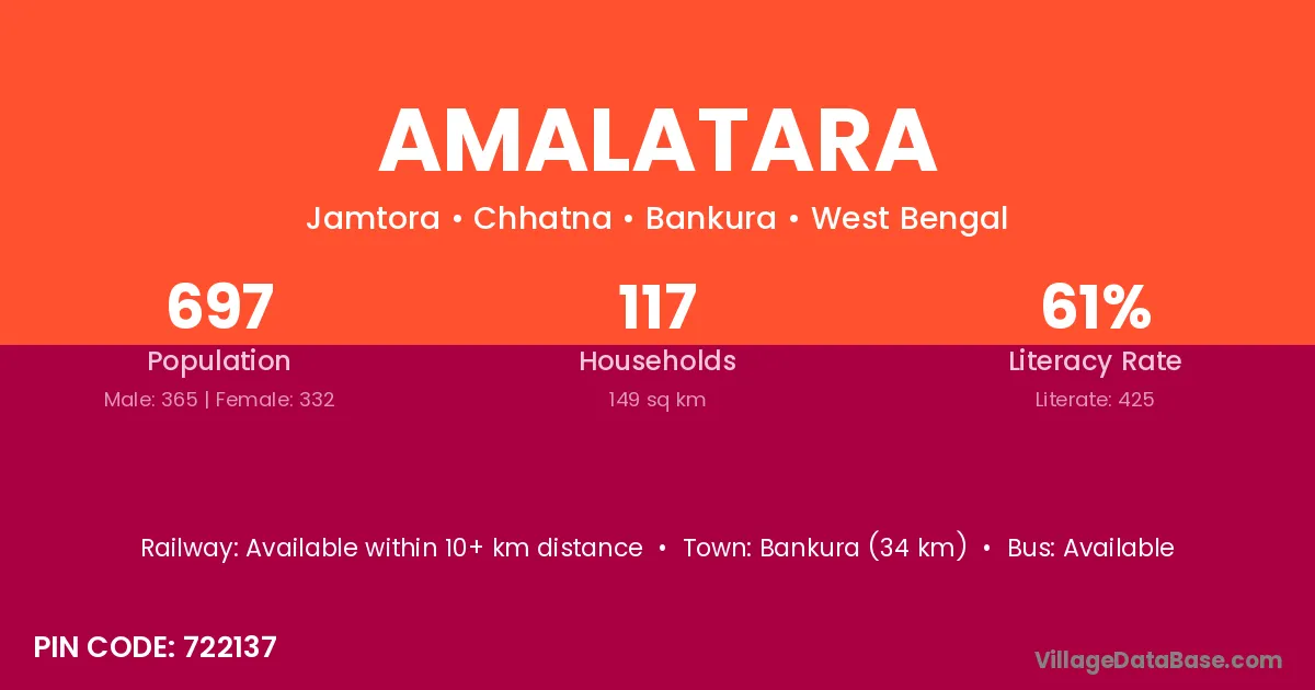 Bankura (34 km) is the nearest town to Amalatara village for major economic activities and is located approximately 34 km away.