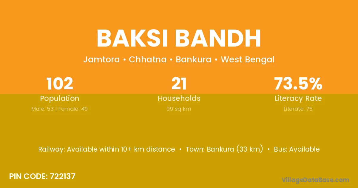 Bankura (33 km) is the nearest town to Baksi Bandh village for major economic activities and is located approximately 33 km away.