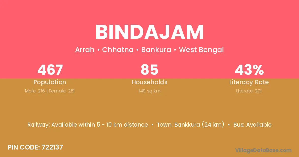 Bankkura (24 km) is the nearest town to Bindajam village for major economic activities and is located approximately 24 km away.