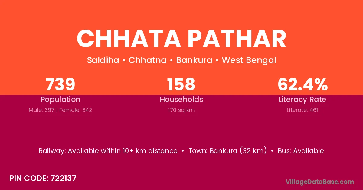 Bankura (32 km) is the nearest town to Chhata Pathar village for major economic activities and is located approximately 32 km away.