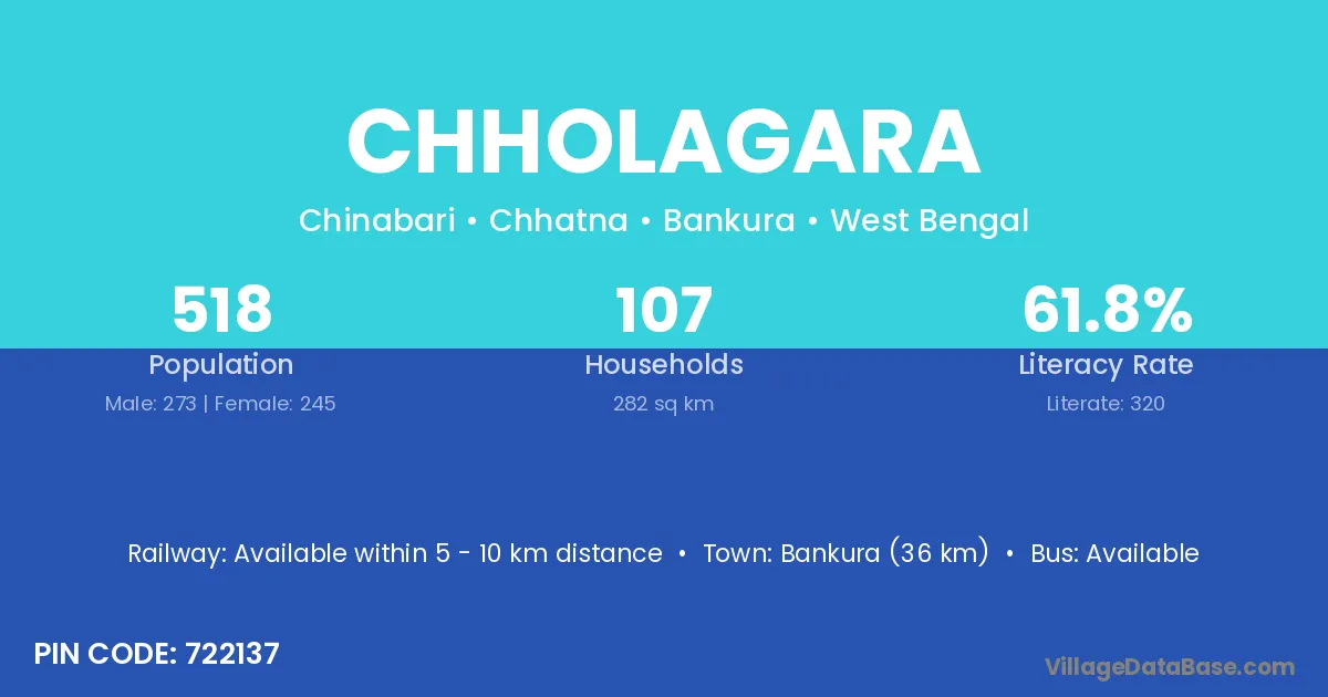 Bankura (36 km) is the nearest town to Chholagara village for major economic activities and is located approximately 36 km away.
