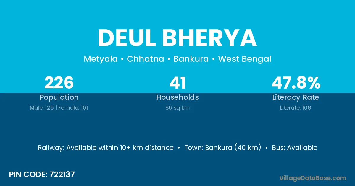 Bankura (40 km) is the nearest town to Deul Bherya village for major economic activities and is located approximately 40 km away.