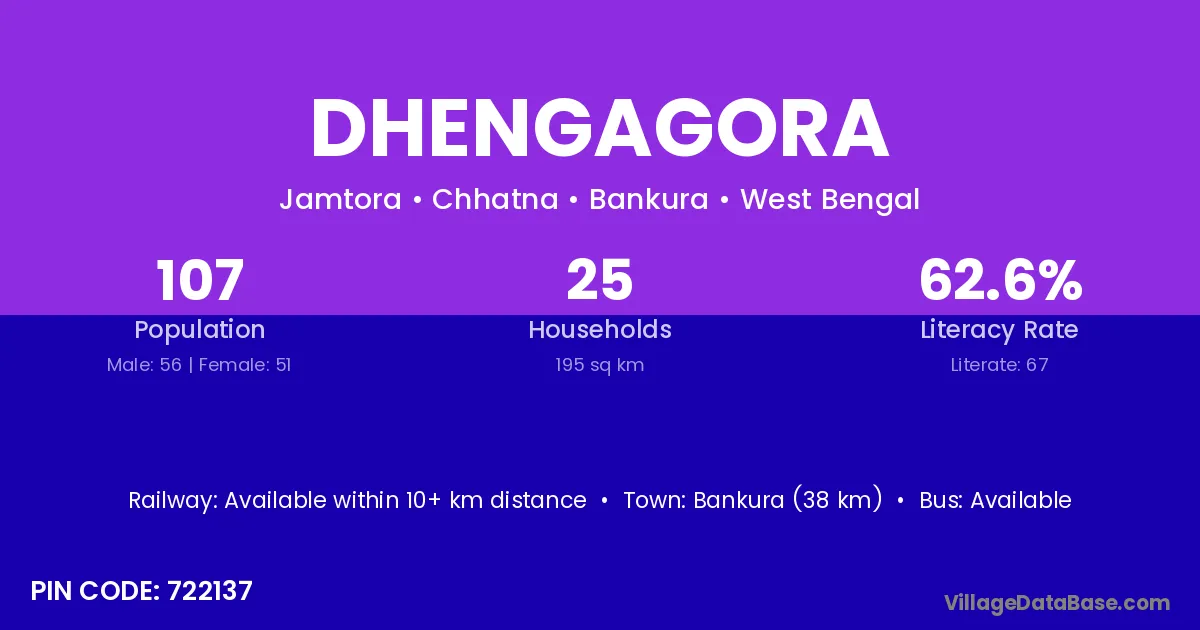 Bankura (38 km) is the nearest town to Dhengagora village for major economic activities and is located approximately 38 km away.