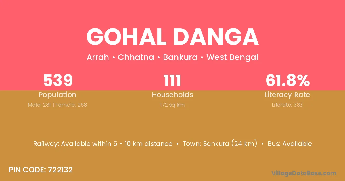 Bankura (24 km) is the nearest town to Gohal Danga village for major economic activities and is located approximately 24 km away.