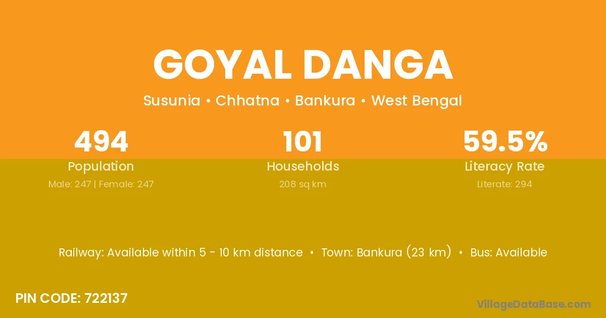 Bankura (23 km) is the nearest town to Goyal Danga village for major economic activities and is located approximately 23 km away.