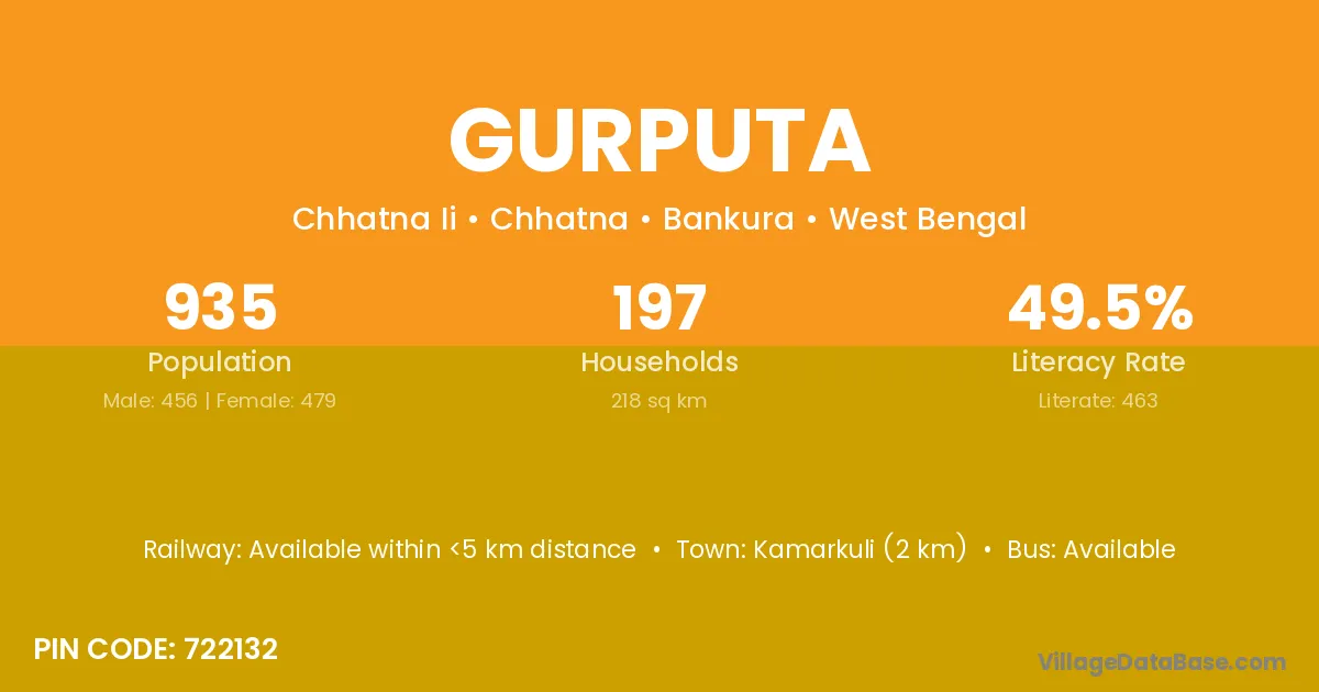 Kamarkuli (2 km) is the nearest town to Gurputa village for major economic activities and is located approximately 2 km away.