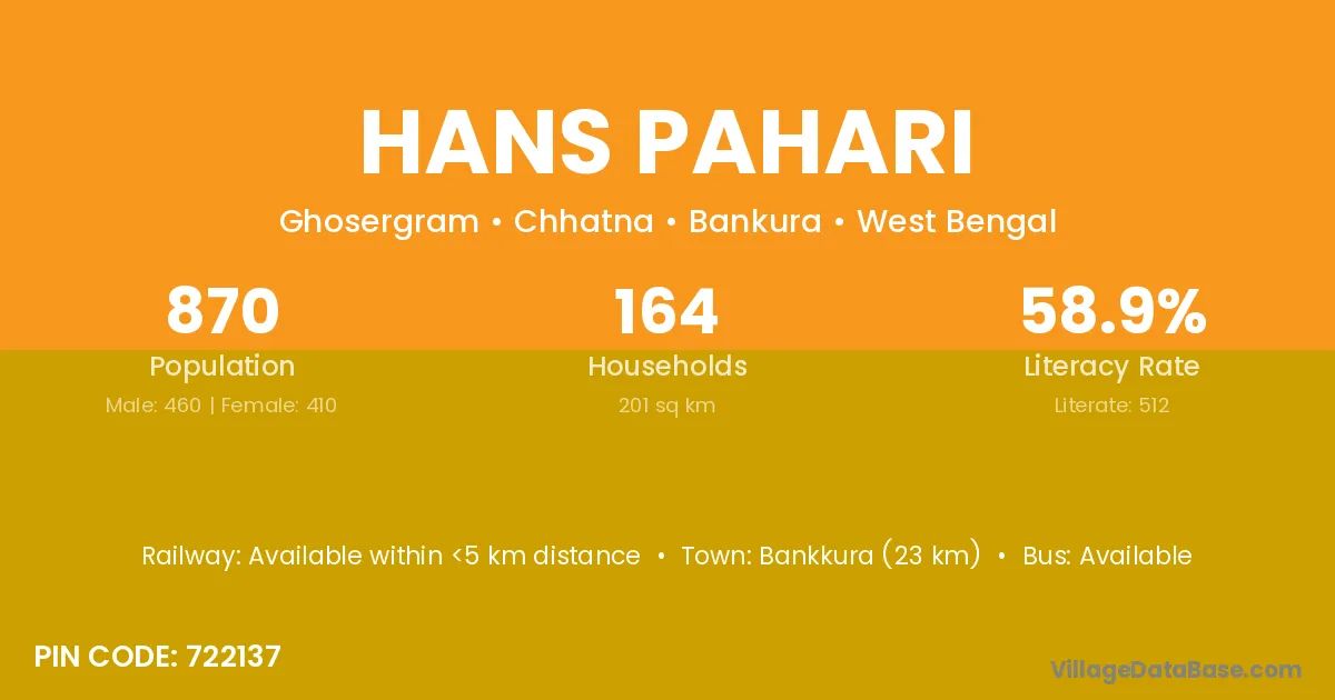 Bankkura (23 km) is the nearest town to Hans Pahari village for major economic activities and is located approximately 23 km away.