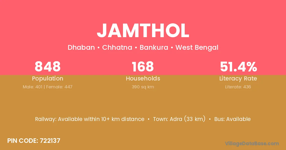 Adra (33 km) is the nearest town to Jamthol village for major economic activities and is located approximately 33 km away.