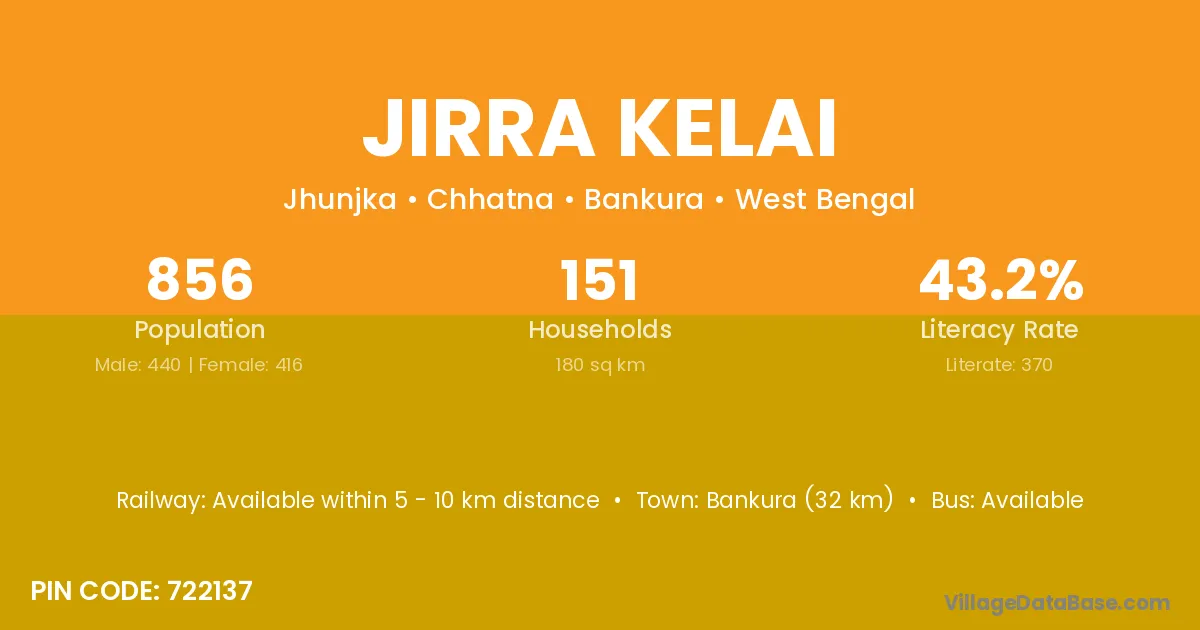 Bankura (32 km) is the nearest town to Jirra Kelai village for major economic activities and is located approximately 32 km away.