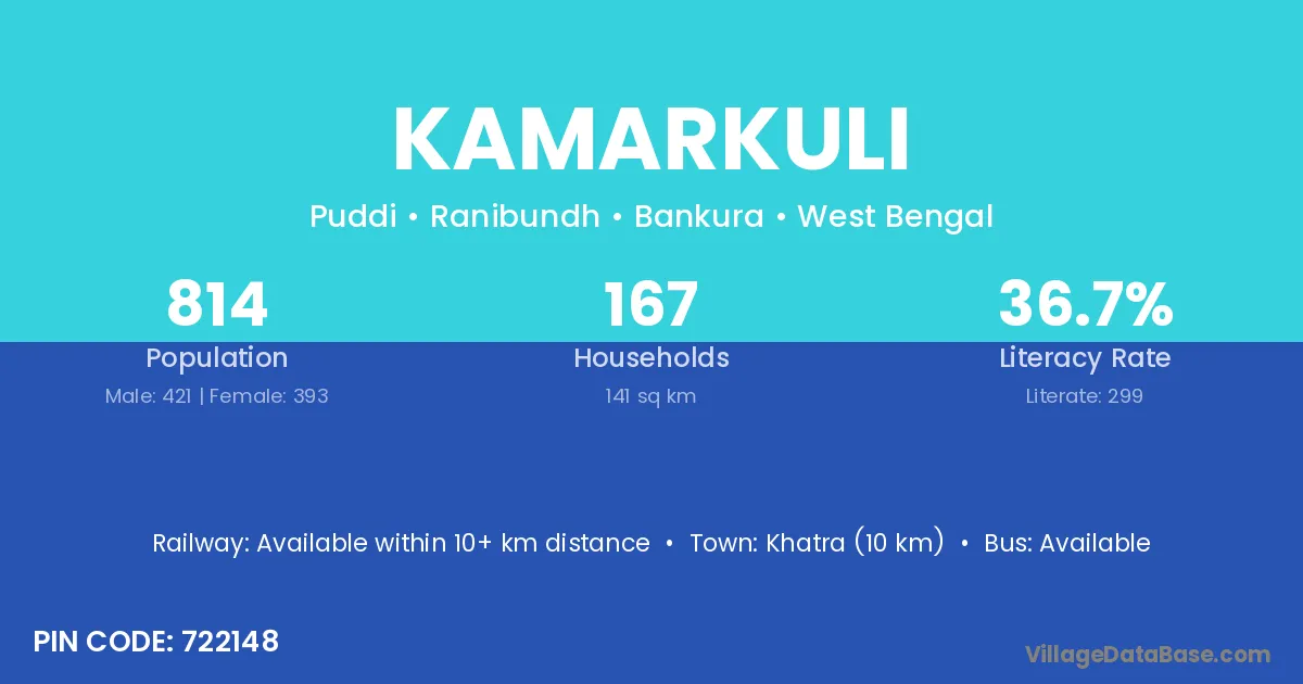 Bankura (14 km) is the nearest town to Kamarkuli village for major economic activities and is located approximately 14 km away.