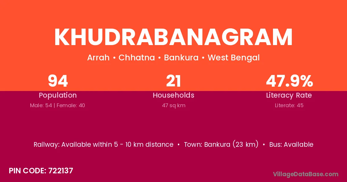 Bankura (23 km) is the nearest town to Khudrabanagram village for major economic activities and is located approximately 23 km away.