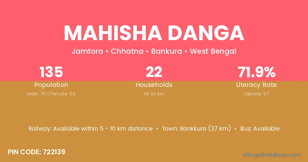 Bankkura (37 km) is the nearest town to Mahisha Danga village for major economic activities and is located approximately 37 km away.