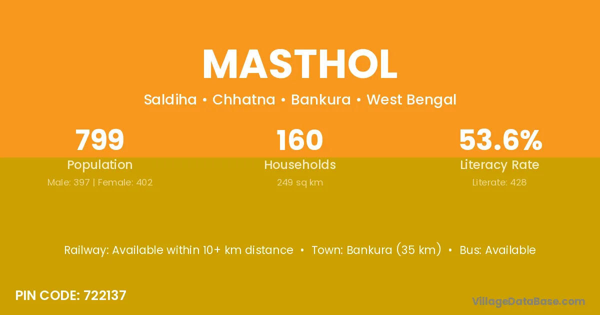 Bankura (35 km) is the nearest town to Masthol village for major economic activities and is located approximately 35 km away.