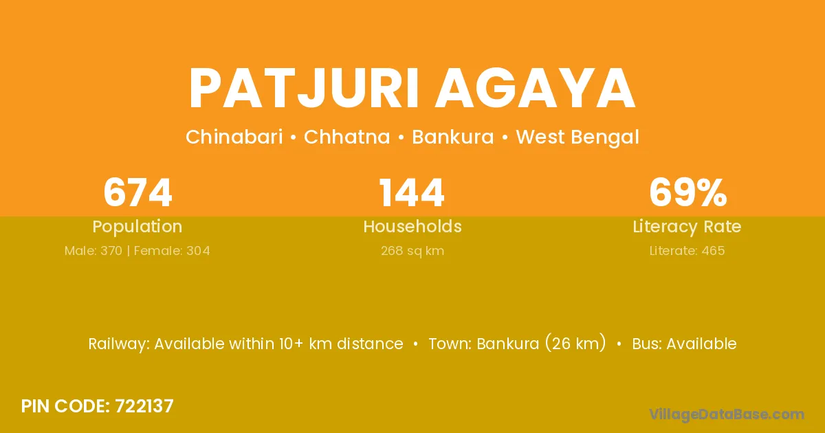 Bankura (26 km) is the nearest town to Patjuri Agaya village for major economic activities and is located approximately 26 km away.