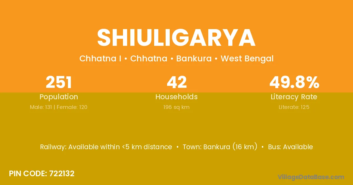 Bankura (16 km) is the nearest town to Shiuligarya village for major economic activities and is located approximately 16 km away.